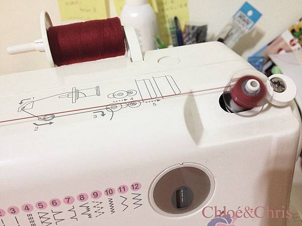 在較精細的小地方或者表情的部分,我就會採用手縫的方式,這時我會挑繡線專用的針,然後使用同款車縫線,一次剪成4條穿到針洞中,這樣就可以達到粗線條的效果。