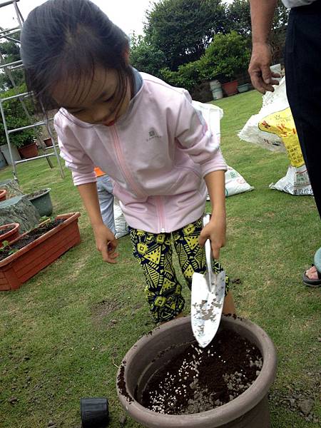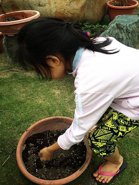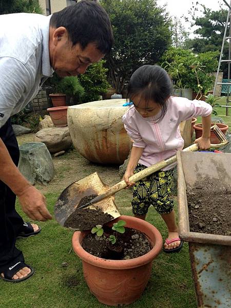 一開始阿公會準備較肥沃的土壤,教孩子們鋪在底層,看這兩小多麼的勤奮專心啊!