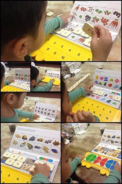 但換成每個主題不同的邏輯教具時,就比較能吸引他的專注力,理解力還蠻快的,雖然對數字還不熟識,但能夠依照步驟的邏輯完成教具的遊戲,並且在自行延伸出一些遊戲,注定是走偕星路線,攤~