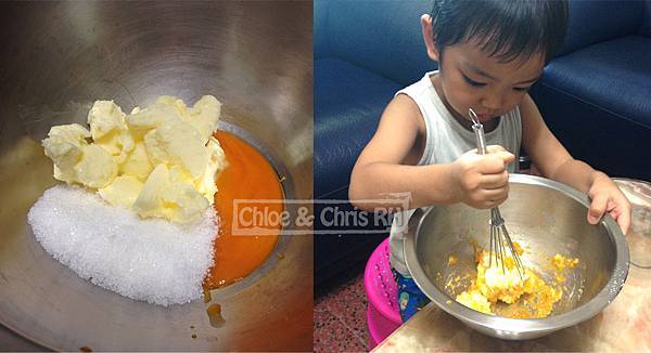 2.將蛋黃、砂糖、軟化的奶油攪拌至乳霜狀