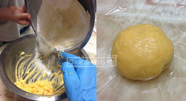 4.這時可以使用萬能的雙手幫忙,以畫圈的方式將麵糊攪拌均勻,這次我將麵粉的比例提高,增加餅乾的硬度,所以如果遇到攪拌時麵粉較乾的情況,可以適時的加入牛奶,漸漸的鍋內的麵粉會慢慢的團結起來變成如右圖的形狀