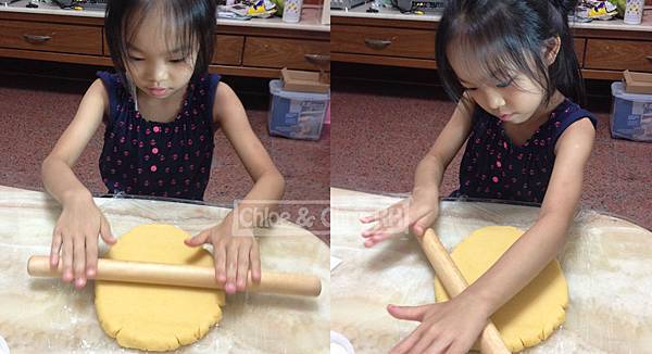 6.在桿麵團時有個小技巧,教室可以在麵團稍微桿平後,上方在加一張保鮮膜,這樣麵團在桿的時候不容易裂開。另外一邊桿的時候邊邊的地方會分裂,記得三不五時用手江面團像內集中後在繼續上下左右平均桿平