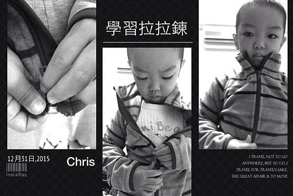 最近這小子很愛自己拉拉錬,拉不起來又氣個半死,拉起來之後就會展露一付自信的模樣。 這個階段的孩子,開始會運用自己的手指頭,完成更多細緻的工作。但是還不適合教育他們拿細筆桿的筆寫字,這可是會影響他們小手的發育。為人父母不用急,因為寫字或是精準的繪圖,再過幾年他們自然而然會做得很好。
