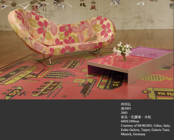 廳中錯落的沙發和扶手椅上像是春天花瓣翩然飛落的花樣,是林明弘取自台灣花布放大的圖案,而鋪在腳下的「地毯」卻編織了坦克車和手榴彈的圖像——這個圖案則是複製於他見過的阿富汗地毯。八○年代阿富汗與蘇俄交戰,阿富汗境內隨處可見蘇俄軍隊與武器,當地人把每天眼睛所見的圖像編織進地毯裡,再把毛毯賣給當時的俄軍,賺來的錢又去買槍砲彈藥打俄軍。地毯本身有著「家」與「私人空間」的溫暖意象,然而上面的圖案卻又矛盾地提示著暴力。日常生活與戰爭暴力的結合,帶給人衝擊與震撼不言而喻。