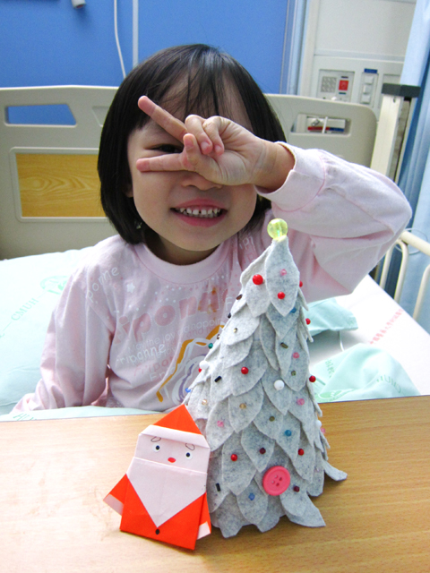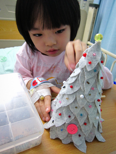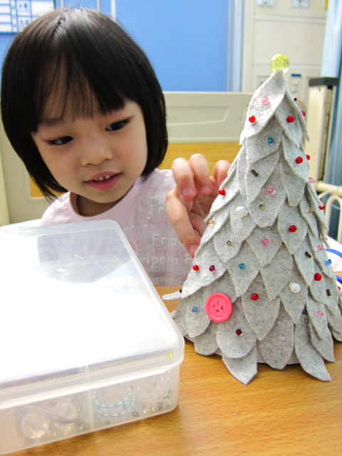 重頭戲來了,快聖誕節了捏,上次與媽媽在家利用不織布黏的聖誕樹已經乾了 ,媽媽特地帶到醫院,跟mi來個最後的裝飾。