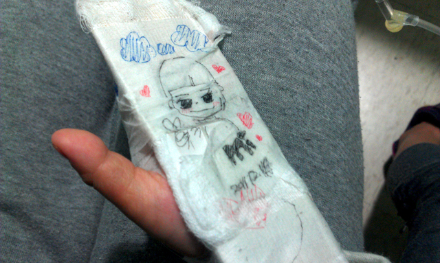 mi在怎麼聽話,當然也沒辦法控制她打了點滴的小手不小心會被自己移動到點滴線,於是貼心的護士阿姨吧她的手加了板子 ,媽媽我一時無聊性起就跟mi玩起來了,隨手拿起幾隻中性筆就這樣畫起來了。