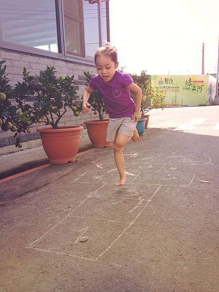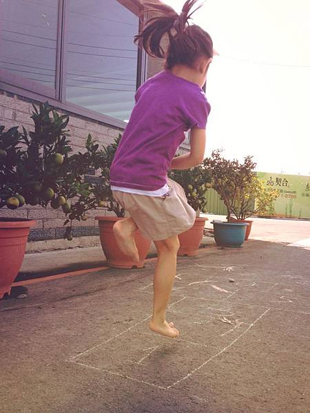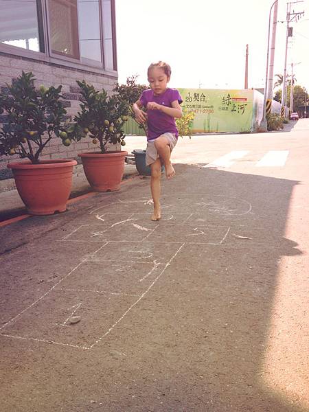 一開始mi看到我再示範的時候,怎麼樣都跳不好,加上很少有機會單腳跳框框,所以總是重心不太穩,但也樂在其中。