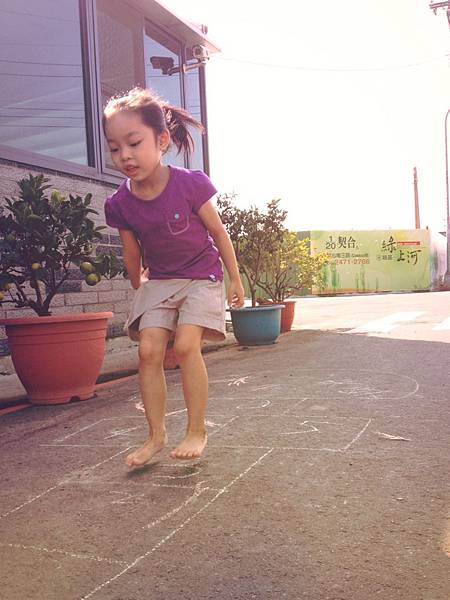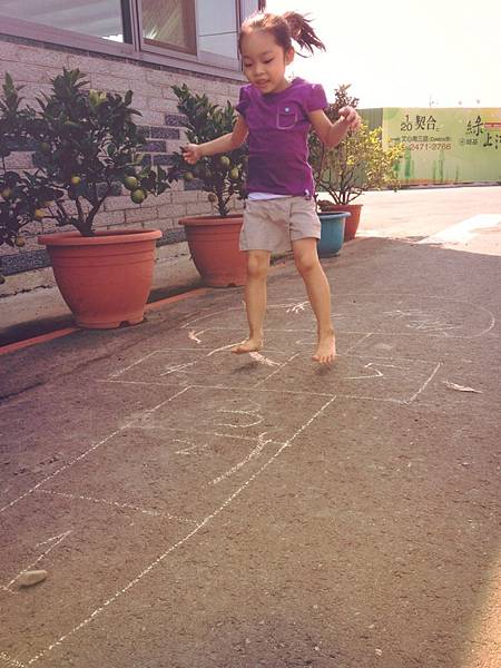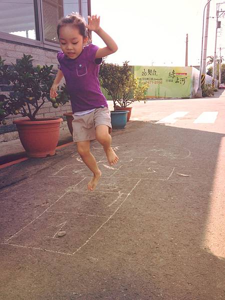 沒多久,漸漸地搞懂遊戲規則了,單腳跳格子的穩定性也越來越好,自己也就開心地跳了起來,瞧!她是不是很棒!