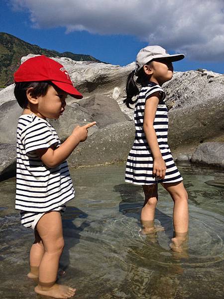 石頭上的青苔,是姊弟們這輩子第一次見到"會沽溜"的大石頭,他們小心翼翼的攙扶著,深怕一個不小心就成了落水雞,看著他腳趾頭的抓力,多麼的謹慎!
