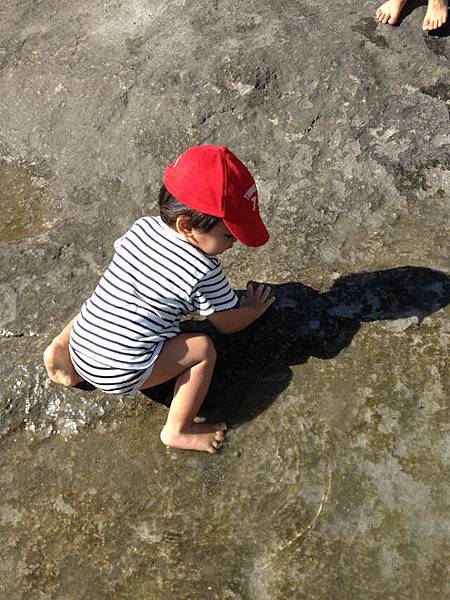 兩姊弟踩進冰涼的海水中,先是一份驚喜加上小害怕,不一會兒開始適應水裡的生態,開心地撿起石頭、找小魚、看藍天、跟著我們聽海的聲音。