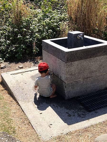 露營區旁的水龍頭有上下兩個出口,下面的出口對弟弟來說,正是剛剛好的玩水工具,只見他一個人在艷陽下,不停地開開關關,玩得超起勁。