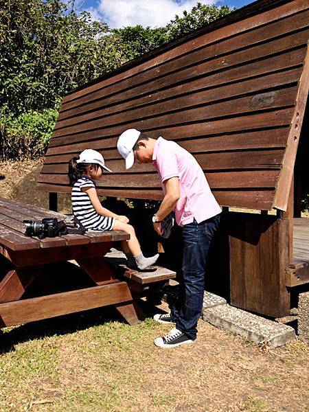 接近十點鐘,溫度逐漸上升,真的開始熱了起來,於是我們緩緩地上了坡道,但還是決定與小子把這樣的藍天好天氣記錄下來,然後我跟孩子們今天有了第一張的合照。