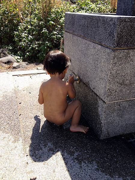 衣服濕透了的弟弟,乾脆脫掉一身的濕衣,來場自然享受陽光之旅,沒想到這樣看起來變成了大小孩,減去不少一歲半小嬰孩的稚氣。