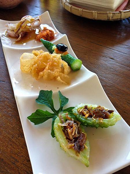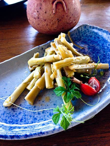 簡單且色彩舒服的三道簡單小菜,最前面是山苦瓜干貝絲,為苦回甘。第二道口感像是海蜇皮,但帶點脆度很特別,山葵加入了蛋黃醬及蝦卵黑豆,少了惱人的黏膩感,濃郁的口感不停在唇齒之間打轉。第三道簡單的小卷絲搭配特製的泡菜,在這組清爽淡雅的菜色中,有了重點式的點綴。