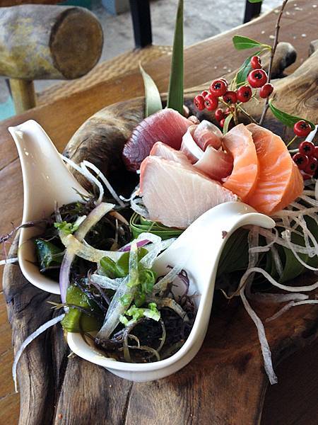 繼續上演著耀忠師傅獨特的料理手法,同樣是層次分明的方式表現,一口將海菜放入嘴哩,咀嚼之中,嘴裡滿滿是海的味道。至於現撈的生魚片,就不在話下了!