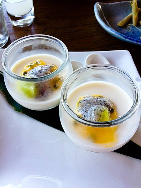 最後是水果奶酪,我其實吃不出來上面黑黑的點點是麼東西,但奶酪搭配著奇異果以及百香果的滋味,很乾淨且舒服。是個很好的Happy Ending