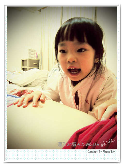 一進檢查室我就先躺在床上,等待醫師進來;不知是不是有了第一胎的經驗,這一胎在飲食方面有比較控制一點,當我躺下來時突然覺得自己的肚子好像沒有六個月來的大,加上剛剛量體重時也沒啥增加,這時心想,該不會dd比較小吧?