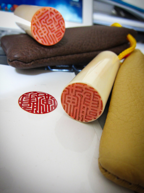 我們用的是吉祥章字體,當初姊姊也是用了這個字體,我跟爸爸都覺得這個字體刻出來得名字真美。尤其搭配上師父自己調製的朱墨,整個質感就加分許多,因為好正是男生,所以他的字體跟姊姊的比起來,有略為加粗了一些,而師父也教我們如何養章,讓這顆印章的色澤可以越來越美,紋路也會隨著時間的不同而有所變化,更神奇的是師父竟然可以從姊姊的印章上,跟我們提到姐姐大約的性格,例如:這個小女孩現在應該很喜歡閱讀,且個性穩定....(有沒有一點給他神奇!)。