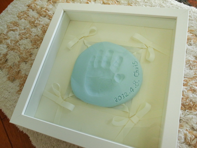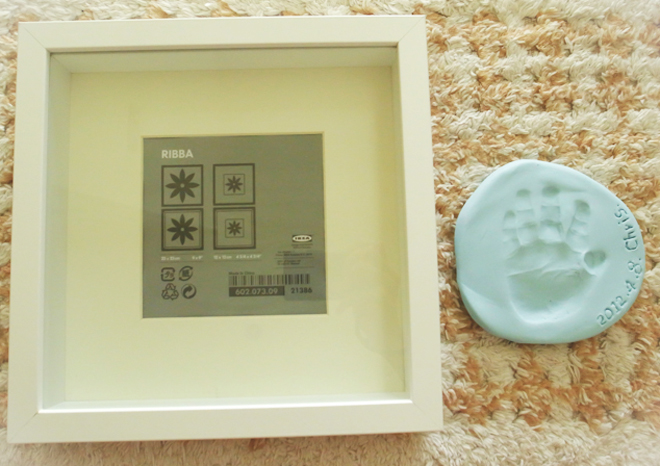 在姊姊9個多月的時候,我們也替她押了手模,事隔多年,原本採購的相框(IKEA)、超輕土(大創)都已經斷貨了,後來我們改買了較大的尺寸,其實效果也不賴,只是體積大了點;超輕土的部分則跑到連鎖大書店去採購,還好!不難找一下就買到了。