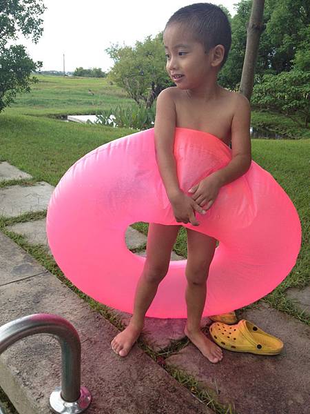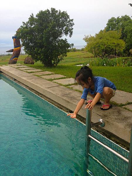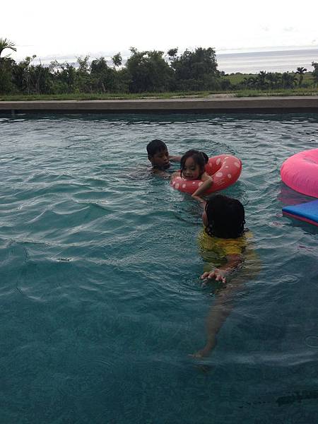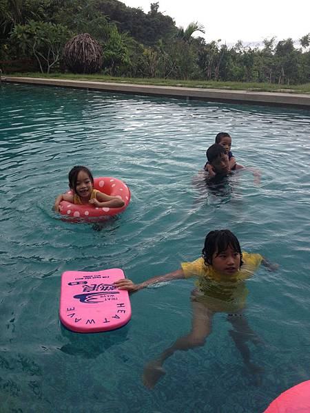 幾個原住民的小朋友一大早就跳下游泳池隨性的游泳起來,姊姊在一旁看了好心動,而這個原住民姊姊也很熱心的將游泳圈讓給Chloe玩。