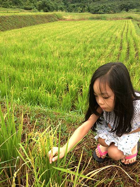 接著我們更深入梯田中,讓孩子摸摸稻穗,感受稻米的重量,這的田跟阿公的不太一樣,溝不會很深,孩子們可以更近的距離接觸這些稻米。