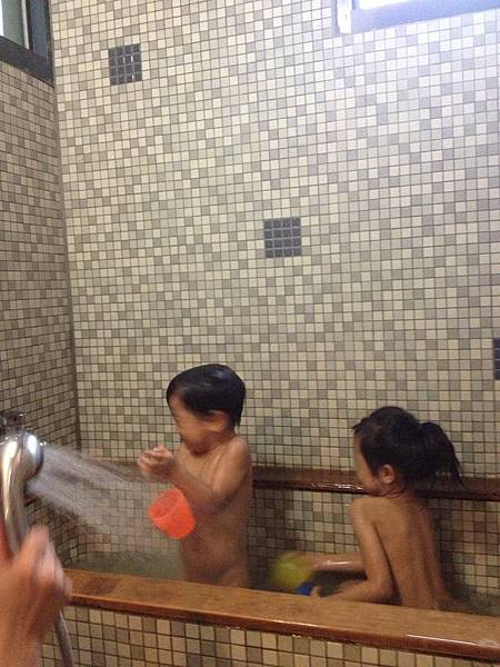 結束游泳樂之後,到了浴室沖洗,姊弟黨也跟著爸爸繼續玩起水仗!