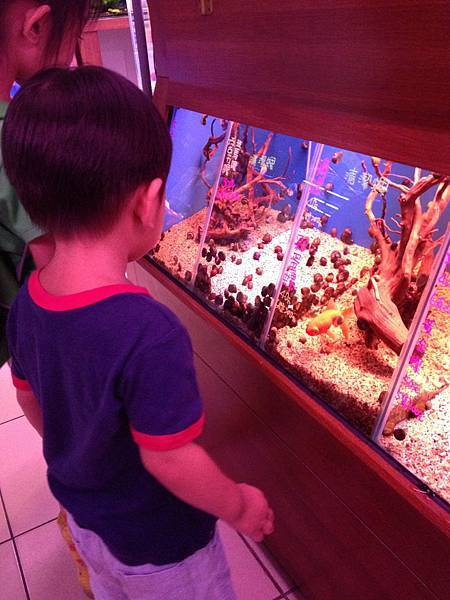 例如:在水族箱前,光看著魚就看了1.2分鐘後說,媽媽,魚ㄟ!魚在做什麼?