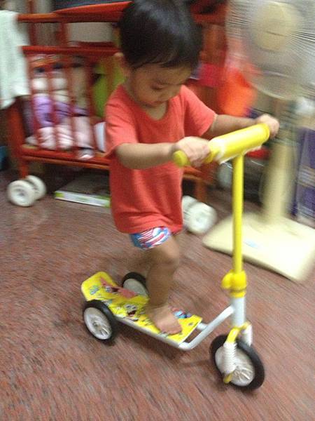 當他開始熟悉一樣玩具時,這玩具就會變成他的囊中物,然後不時開發他自己心的玩法,現在連滑板車,他都已經駕輕就熟,還常常在上面表演金雞獨立。