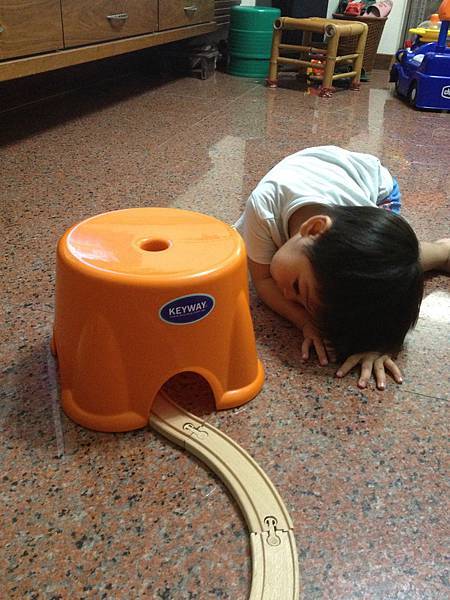 當凳子變成山洞時,他也會仔細觀察怎麼樣讓火車從蜿蜒的軌道經過他建立的小山洞。