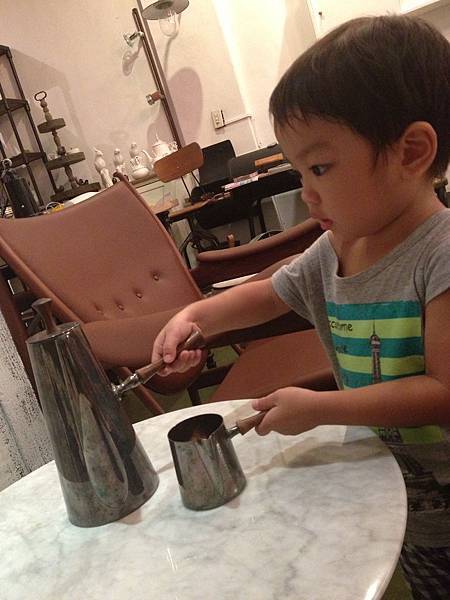 這天跟爸爸媽媽一起去看家具,看見旁邊有個茶壺及倒壺,因為之前默默的在旁邊看媽媽拿起類似的茶海在把玩,於是看到這組茶具,也立刻有婆有像的學起來了。