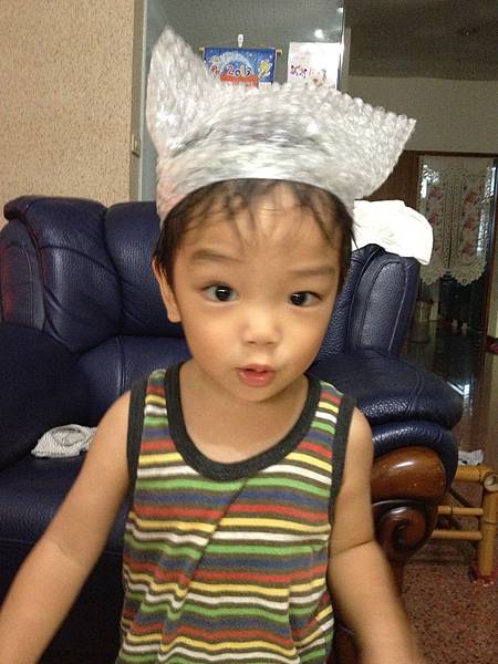 個性活潑的他也常突如其來的有些新玩法,泡泡緩衝袋玩了兩天後,就自己把它當作浴帽袋在頭上,阿嬤看他滿頭大汗要幫他拿下來。但他堅持要帶著等媽媽回來讓媽媽看!